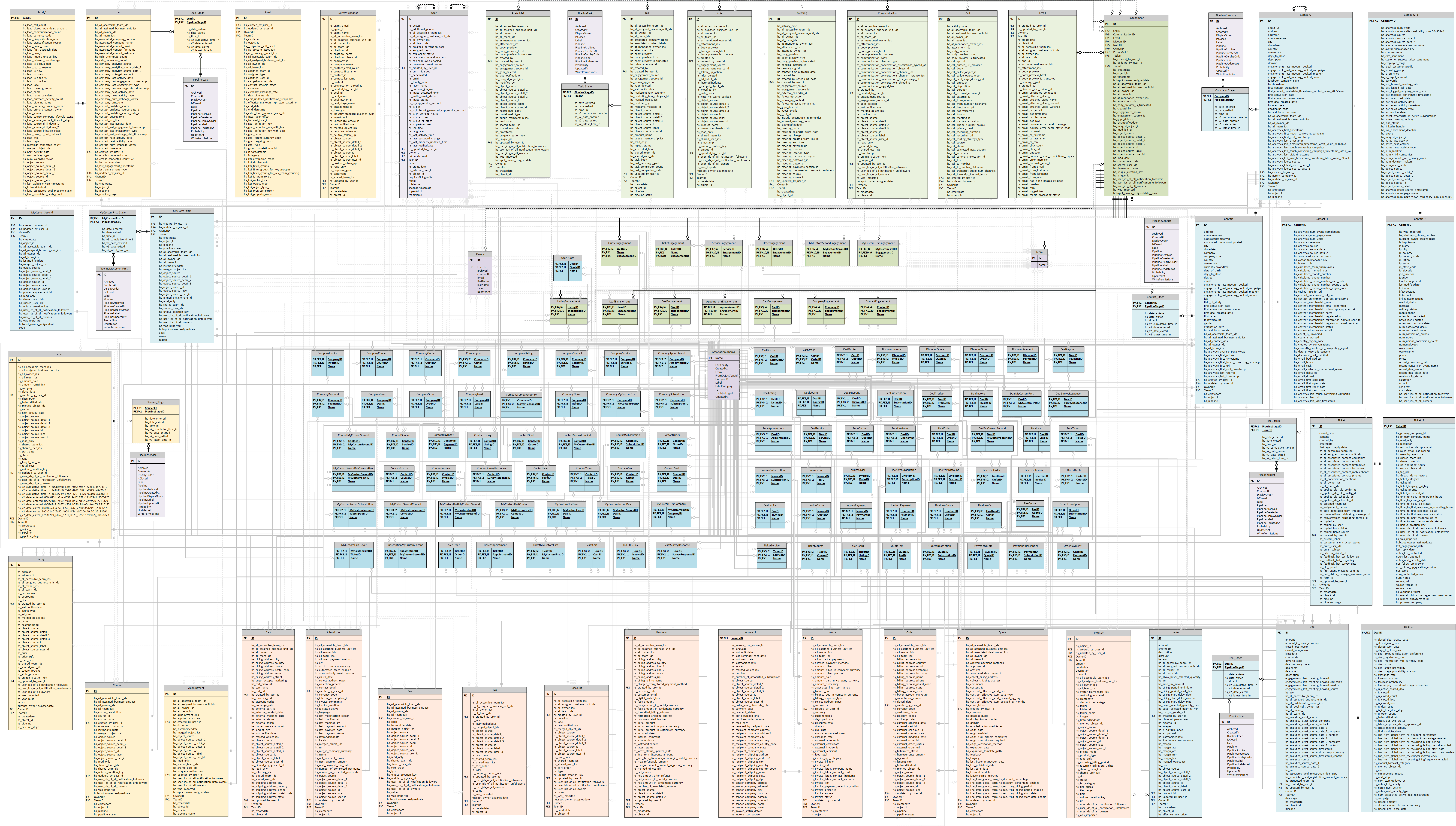 DataSync generates your data schema dynamically based on your objects and relations defined. Here is a sample DB generated for one of the sandbox portals with no modifications done except two custom objects added. Tables here are artificially shortened to showcase the chaining feature. In reality a single SQL table can accomodate hunderds of columns before chaining becomes necessary.